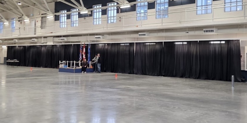We have lots of Banjo drape fabric colours to choose from.  This is the standard material used for tradeshow booths.  We have forest green, burgundy, red, royal blue, black, ivory, yellow, silver/grey, purple and even some orange!