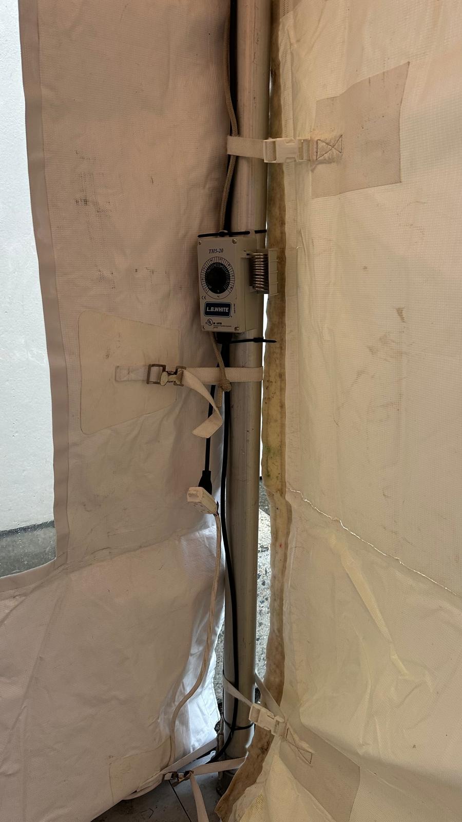 They run on propane for fuel and electricity for the forced air fan. There are three sizes available. The LB40 is enough to heat a 20 x 20 space with a small opening or a 20 x 40 space with no openings. Heater is placed outside the tent and ducting used to blow hot air into your space.
